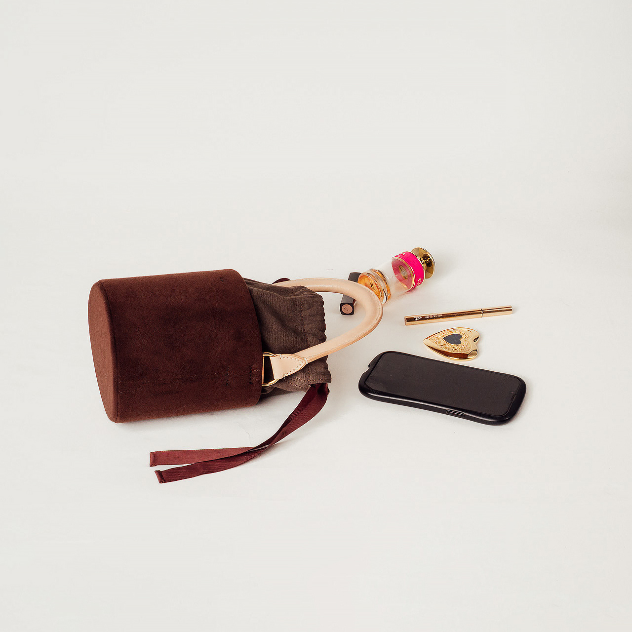 財布やスマートフォン、リップなどのお出かけに欠かせないアイテムが心地よく収まる、計算されたサイズ感。見た目の可愛さだけでなく、軽くて持ち運びやすいのも魅力。巾着仕様なので、中が見えない仕様です。