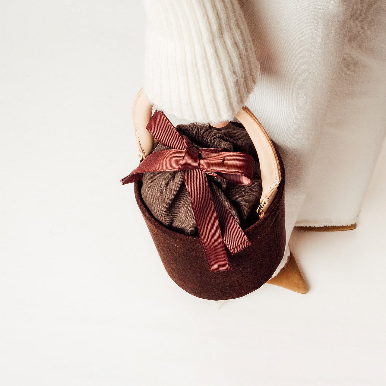 柔らかな曲線と、静かに揺れるリボンが特徴のバケット バッグ。クラシックな美しさに、繊細な遊び心が添えられたアイテムです。本体には、毛並みの陰影が美しいスエード調の人工皮革を使用。