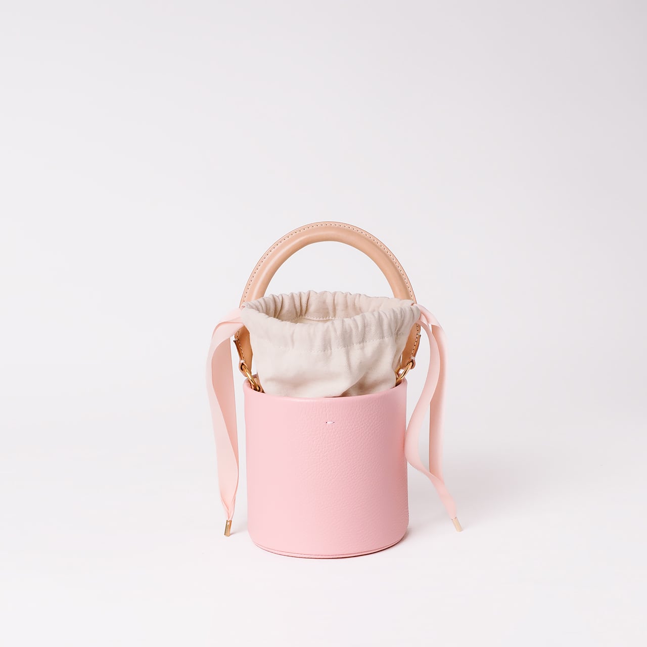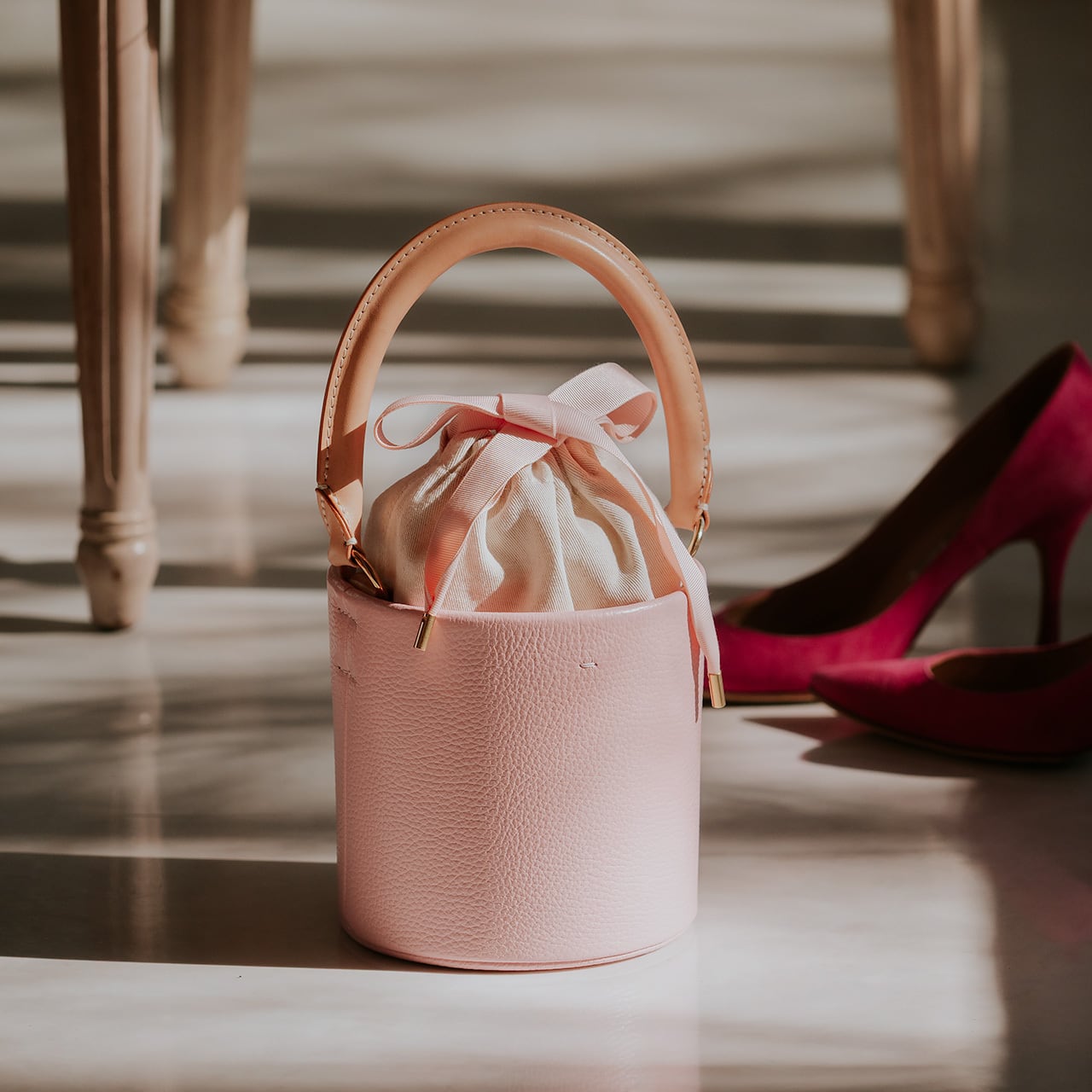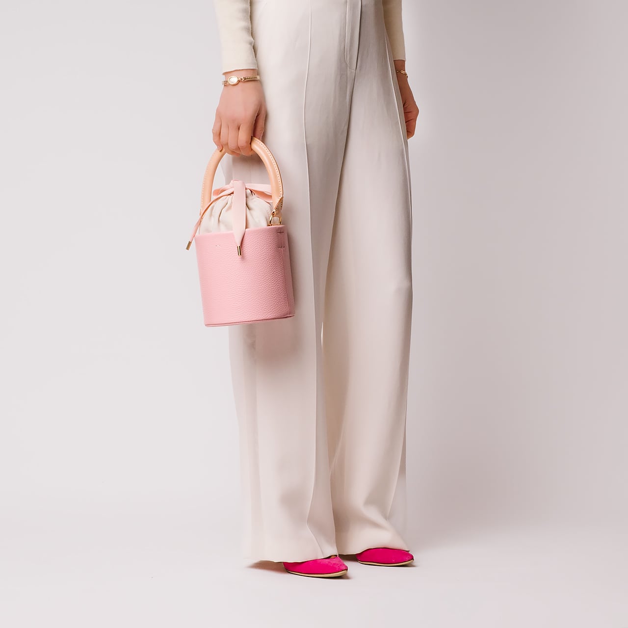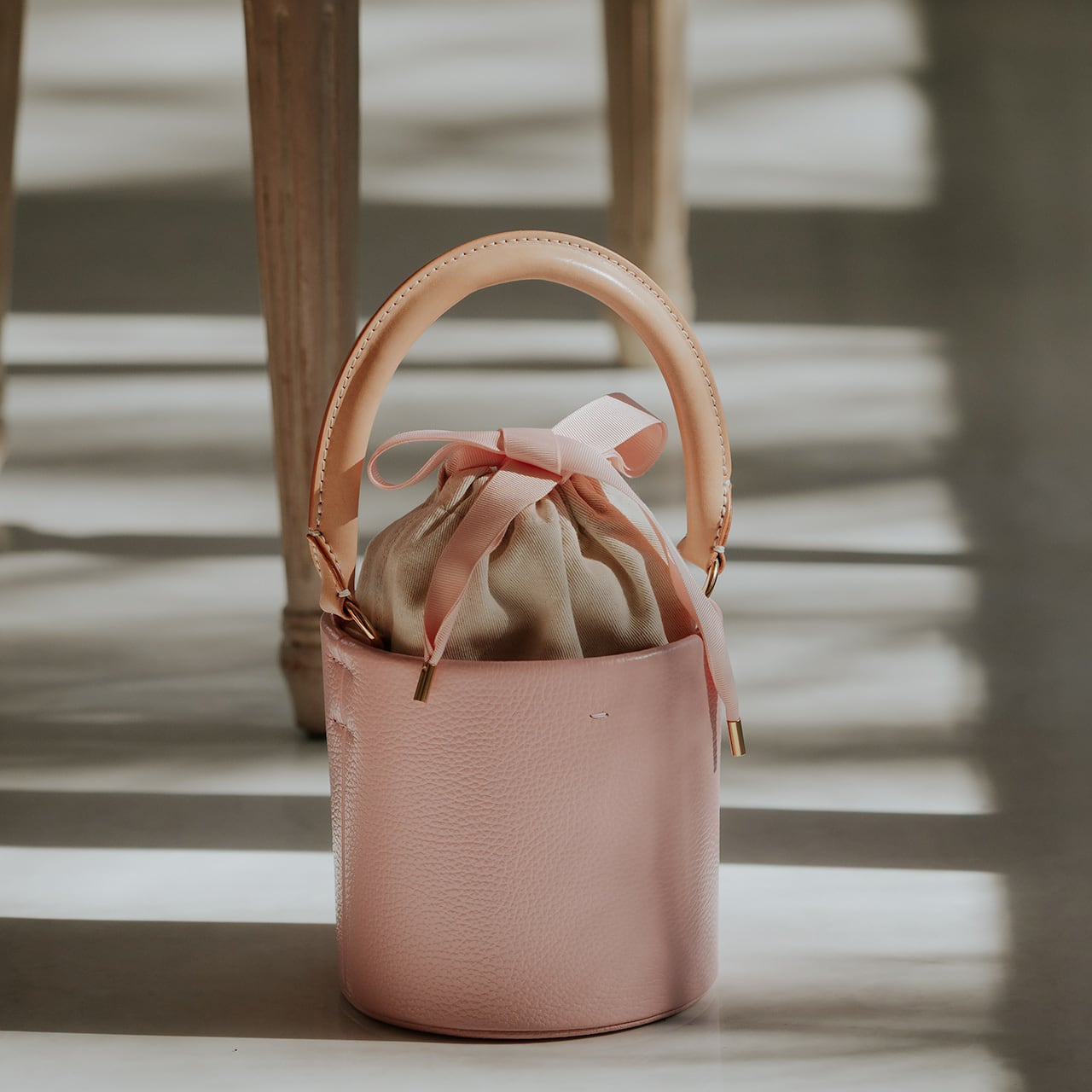 淡いピンクのレザーが、装いにやさしい高揚感を添えます。